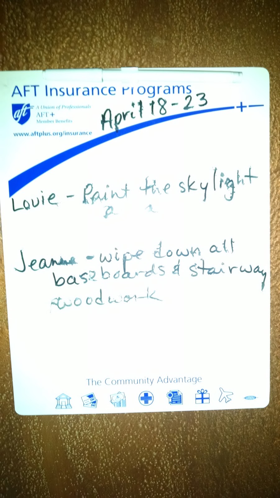 It's springtime, which is lovely, but I always seem to find myself overwhelmed and stressed at the end of the school year. There are more things to be done than I have time to do, and it's easy to get discouraged. A few weeks ago, Louie gave me a pep talk about not focusing on all the things I *don't* get done, but rather being happy about what I *do* get done each week. So I asked him, "What *one* thing do you want to get done this week?" And I picked one thing. I wrote it on the board attached to the entryway / garage door.